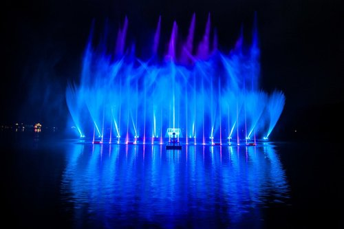 在園博湖里,高低錯落融合炫目多彩的燈光,制造出氣勢恢弘而又多變的造型,展示奇妙的水景藝術(shù)效果。