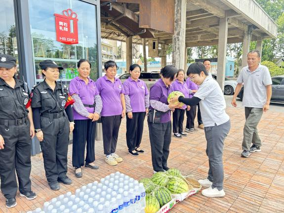 7月19日下午,1907公司執(zhí)行董事張慧杰帶隊(duì)前往園區(qū)各服務(wù)場所,向在高溫下堅(jiān)守崗位的一線職工表示親切慰問,并送去西瓜、礦泉水、風(fēng)油精、十滴水等防暑降溫物資。